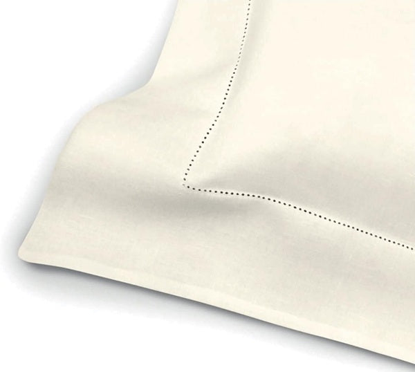 Le federe a tre volani con orlo a giorno impreziosiscono il letto con un dettaglio sartoriale ricercato, tipico della biancheria di alta gamma.