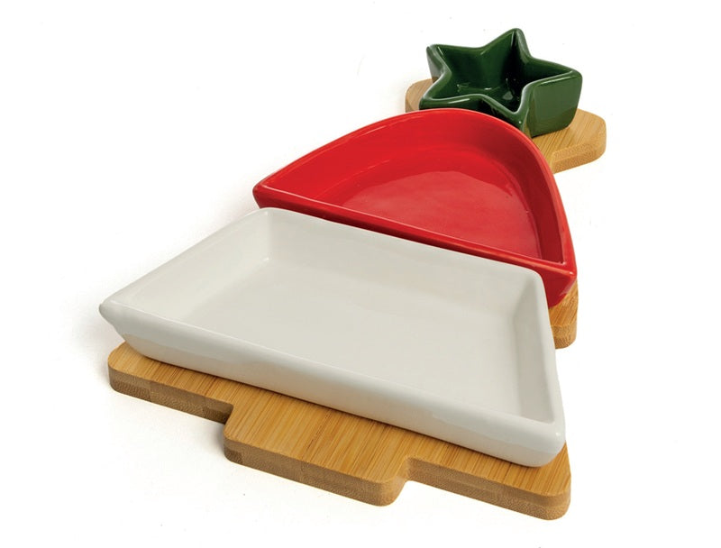 La particolare forma di albero di Natale e la combinazione di bamboo naturale (80%) e dolomite (20%) creano un contrasto raffinato, ideale per servire snack, salse, stuzzichini e mini antipasti.