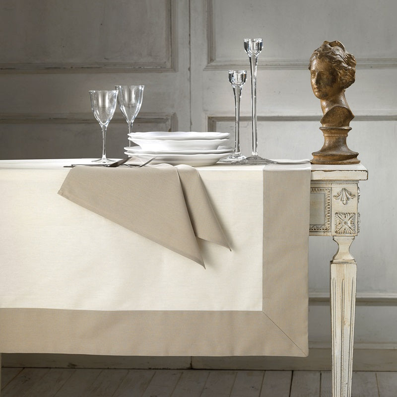 La tovaglia è arricchita da una raffinata balza applicata e abbinata a tovaglioli coordinati, disponibili in diversi colori e misure per adattarsi a ogni occasione.