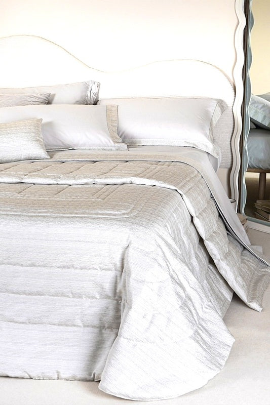 La sua texture sottile evoca la quiete di un paesaggio naturale, vestendo il letto con una grazia eterea ed elegante.